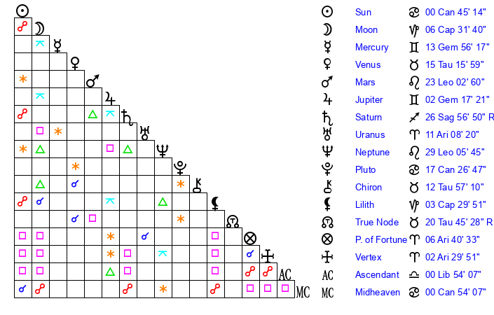 | Pluto | 17 Cancer 27 | 3 Aquarius 18 | 19 Cancer 31 |