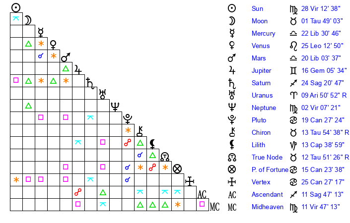 | Moon | 1 Taurus 48 | 27 Virgo 27 | 17 Scorpio 1 |