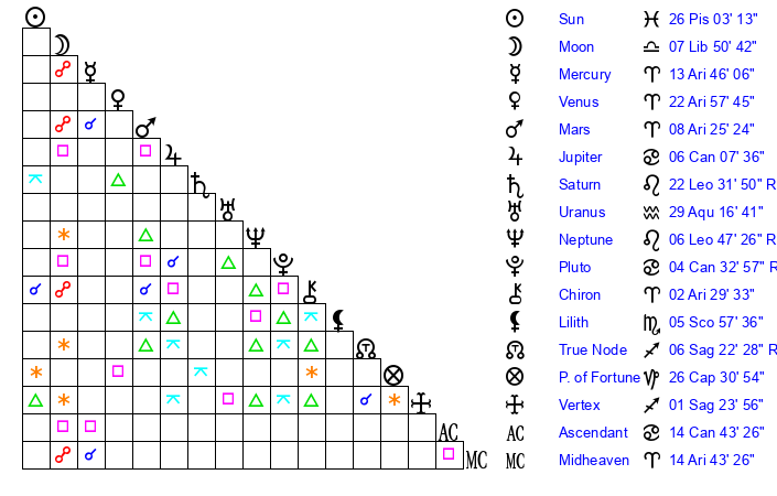 | Mercury | 13 Aries 46 | 9 Aries 11 | 29 Cancer 23 |