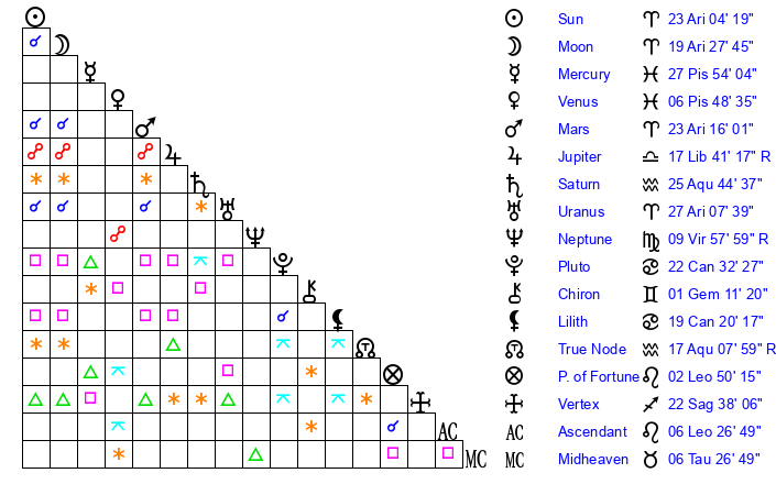 | Sun | 23 Aries 4 | 24 Aries 1 | 20 Cancer 35 |