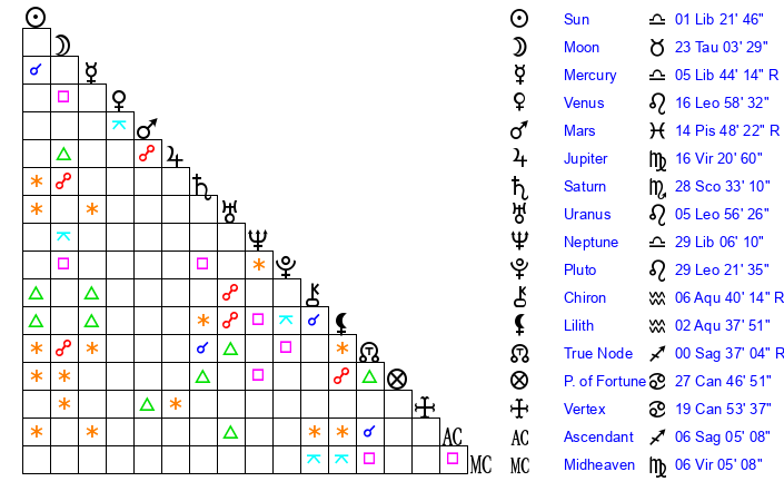 | Neptune | 29 Libra 6 | 0 Aries 43 | 1 Scorpio 33 |