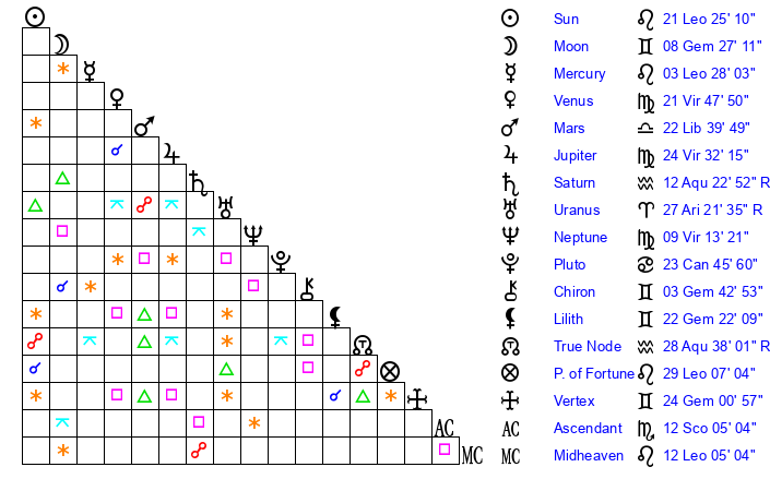 | Neptune | 9 Virgo 13 | 1 Aries 44 | 12 Virgo 7 |