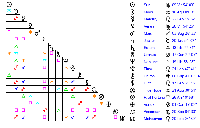 | Venus | 28 Virgo 55 | 9 Leo 18 | 28 Sagittarius 20 |