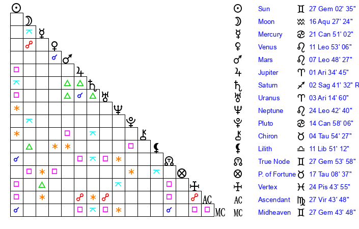 | Moon | 16 Aquarius 29 | 5 Aries 5 | 24 Virgo 42 |
