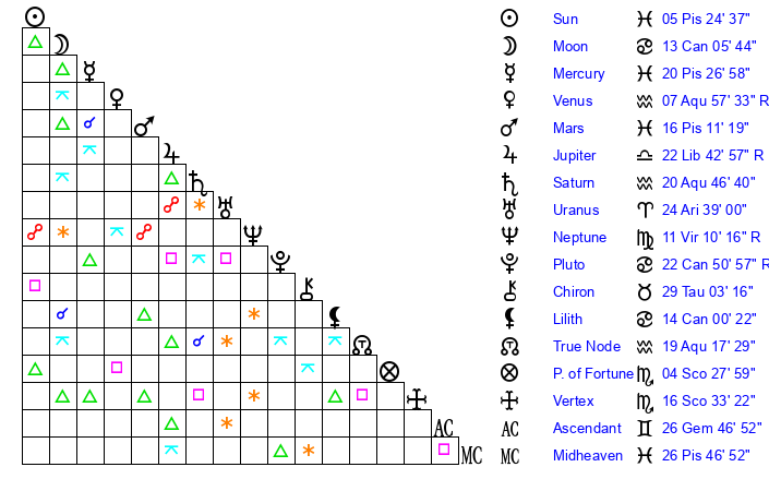 | Sun | 5 Pisces 24 | 6 Pisces 20 | 4 Gemini 44 |