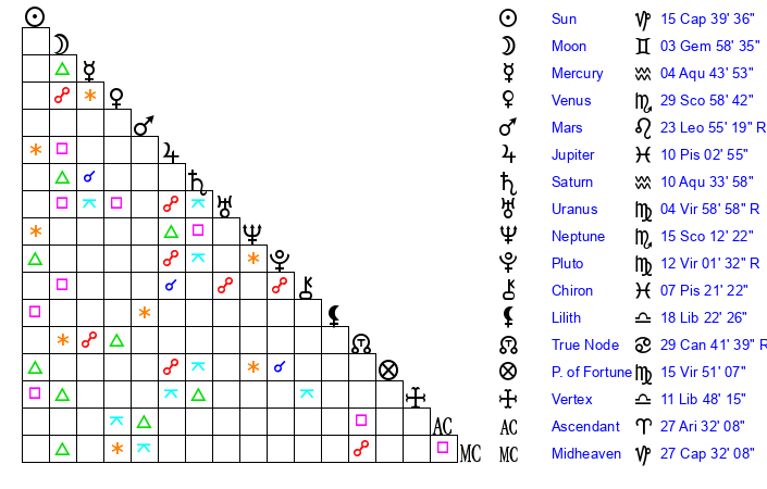 Pluto | 12 Virgo 1 | 1 Aquarius 14 | 10 Virgo 40 |