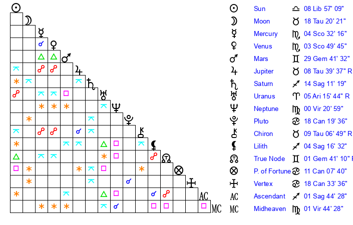 Moon | 18 Taurus 6 | 7 Aquarius 35 | 7 Sagittarius 24 |