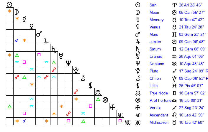 | Neptune | 10 Aquarius 48 | 0 Aries 41 | 10 Aquarius 58 |