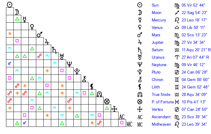 | Neptune | 9 Virgo 46 | 1 Aries 24 | 12 Virgo 19 |