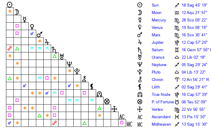 | Sun | 18 Sagittarius 45 | 18 Sagittarius 53 | 12 Aquarius 42 |