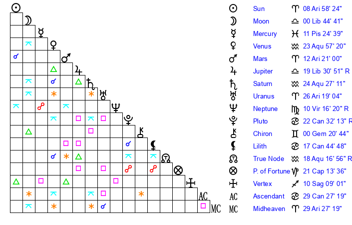 | Sun | 8 Aries 58 | 9 Aries 55 | 6 Cancer 55 |