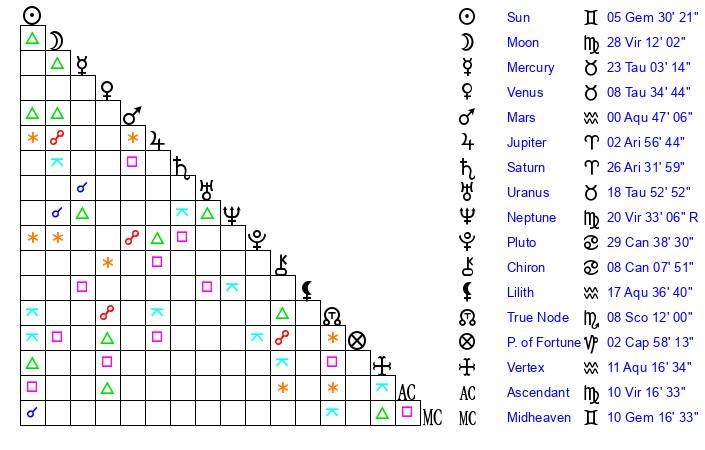 | Moon | 28 Virgo 16 | 14 Gemini 53 | 25 Scorpio 39 |