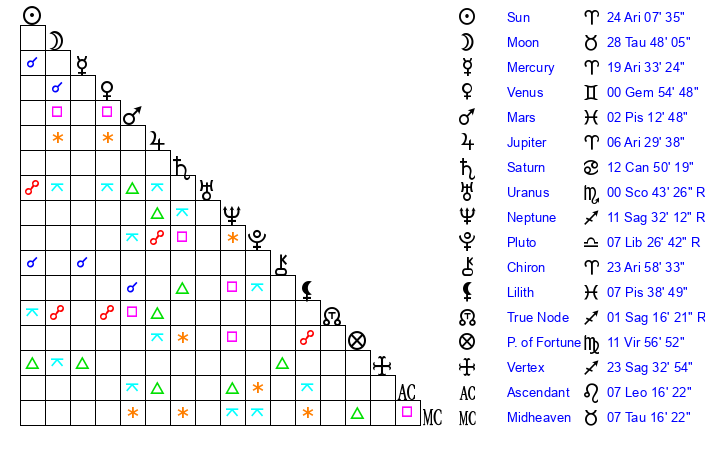 | Sun | 24 Aries 7 | 25 Aries 0 | 12 Gemini 29 |