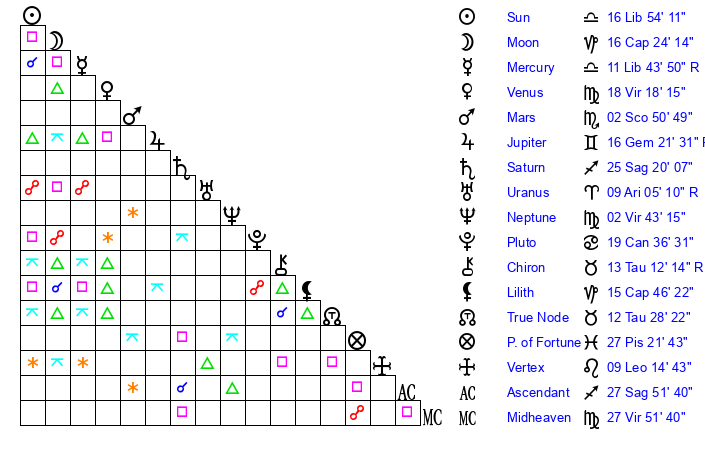 | Sun | 16 Libra 54 | 17 Libra 38 | 23 Capricorn 50 |