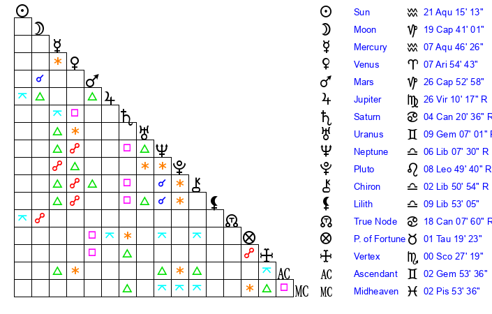 Mercury | 7 Aquarius 47 | 22 Aquarius 30 | 17 Aries 34 |
