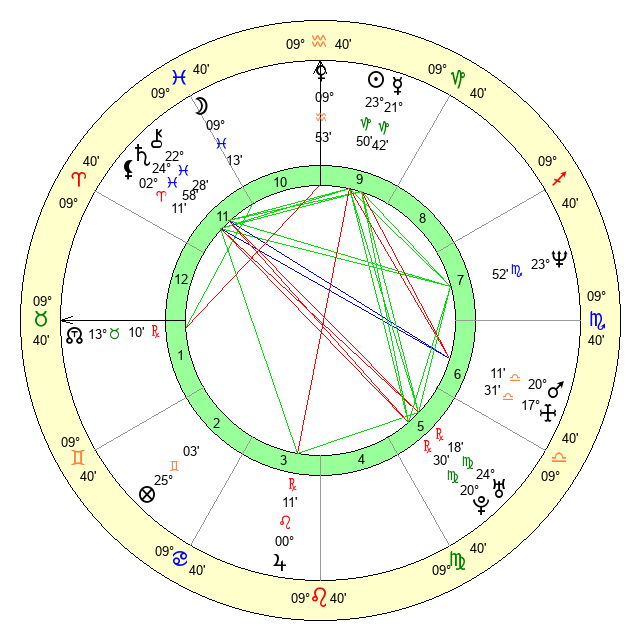 | Moon | 9 Pisces 15 | 4 Leo 16 | 19 Aries 42 |