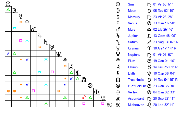| Sun | 1 Virgo 59 | 2 Virgo 45 | 7 Sagittarius 1 |