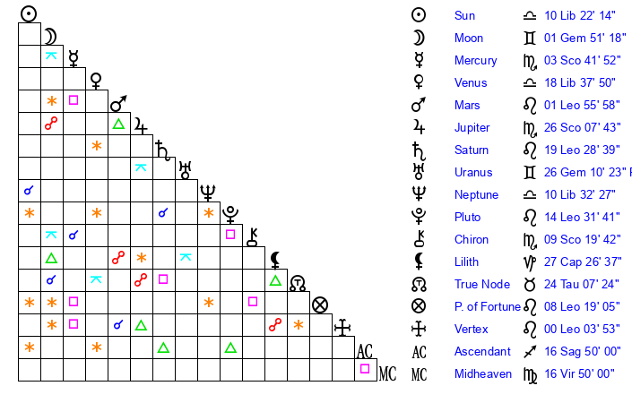 | Sun | 10 Libra 23 | 11 Libra 28 | 28 Sagittarius 44 |