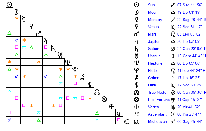 | Sun | 7 Sagittarius 42 | 8 Sagittarius 32 | 28 Aquarius 0 |
