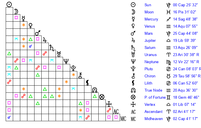 | Sun | 0 Capricorn 25 | 1 Capricorn 6 | 3 Aries 22 |