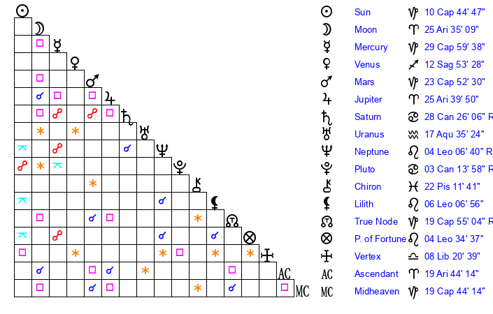 | Moon | 25 Aries 36 | 3 Aquarius 26 | 4 Aries 10 |