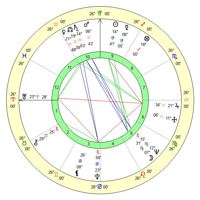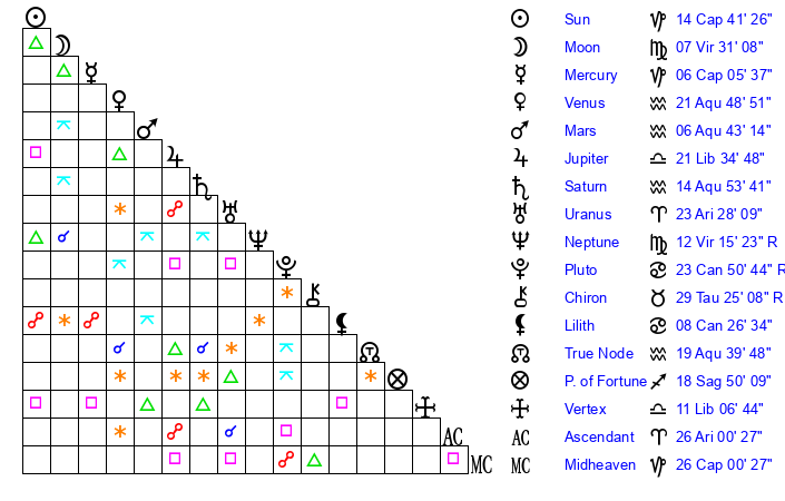 | Moon | 7 Virgo 30 | 16 Leo 8 | 26 Capricorn 5 |