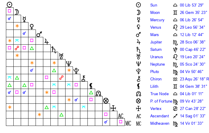 | Moon | 26 Gemini 33 | 3 Scorpio 59 | 27 Scorpio 20 |