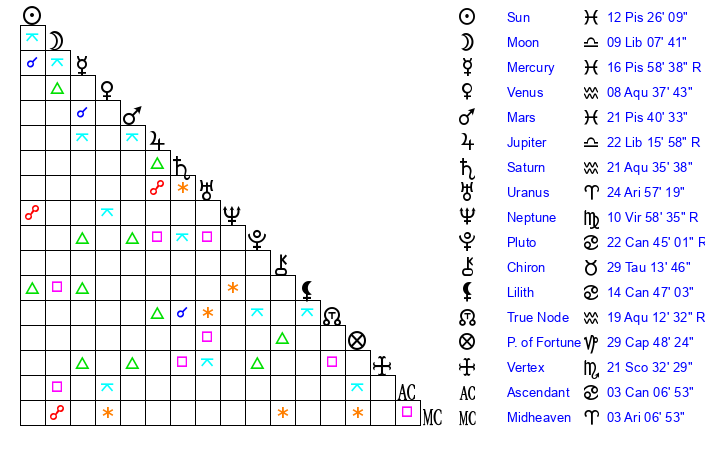 | Sun | 12 Pisces 26 | 13 Pisces 22 | 11 Gemini 27 |