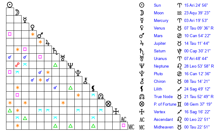 | Uranus | 7 Aries 48 | 25 Taurus 0 | 11 Aries 21 |