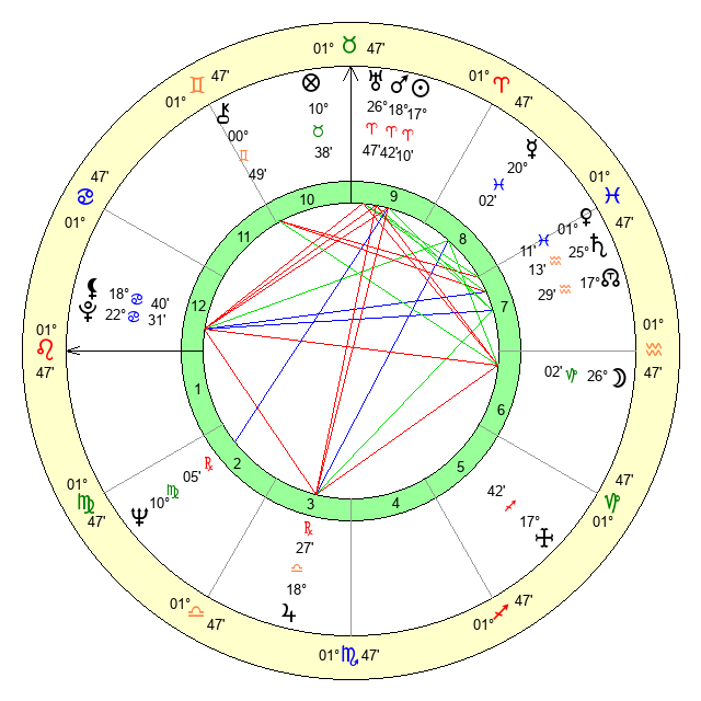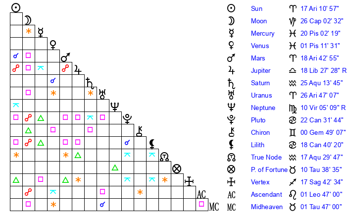 | Sun | 17 Aries 11 | 18 Aries 7 | 14 Cancer 52 |