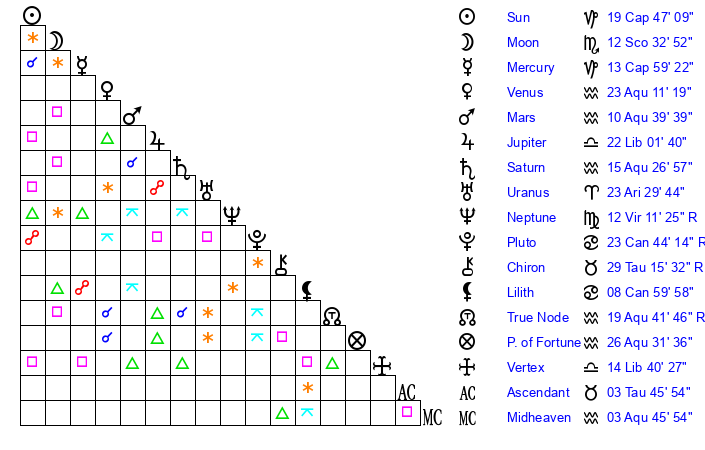 | Mars | 10 Aquarius 40 | 20 Capricorn 9 | 22 Aries 31 |