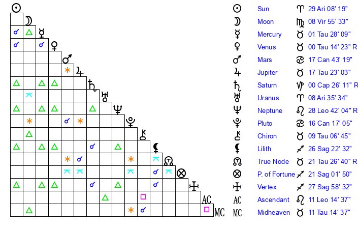 | Venus | 0 Taurus 14 | 25 Pisces 29 | 17 Gemini 22 |