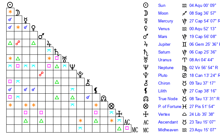 | Moon | 8 Sagittarius 32 | 6 Sagittarius 16 | 20 Taurus 9 |