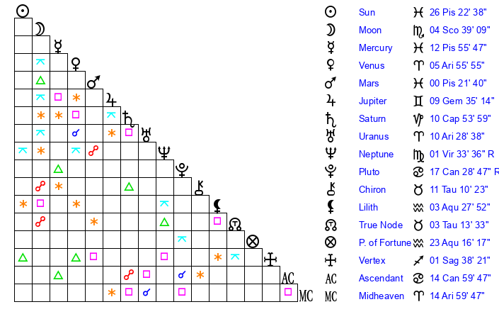| Neptune | 1 Virgo 34 | 29 Pisces 31 | 1 Virgo 12 |