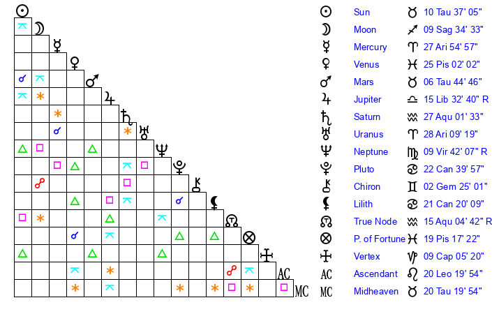 | Uranus | 28 Aries 9 | 26 Taurus 22 | 1 Taurus 26 |