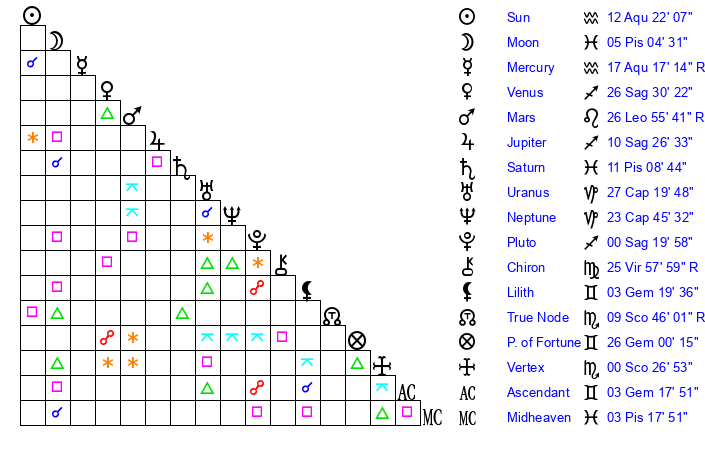 | Sun | 12 Aquarius 21 | 13 Aquarius 5 | 12 Pisces 38 |