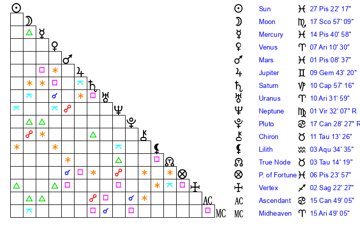 | Moon | 17 Scorpio 54 | 16 Scorpio 22 | 26 Aries 18 |