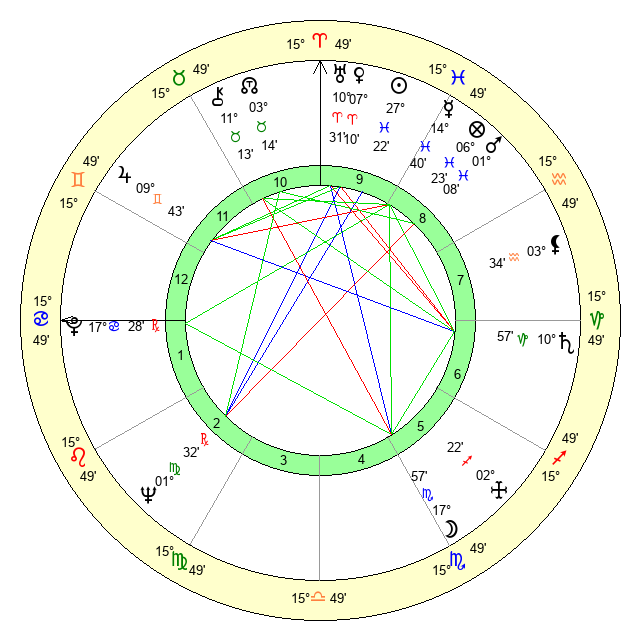 | Neptune | 1 Virgo 32 | 29 Pisces 33 | 1 Virgo 14 |