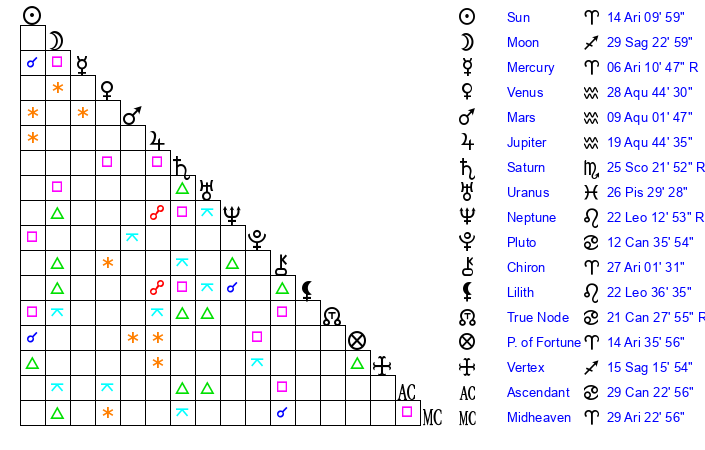 | Pluto | 12 Cancer 36 | 3 Aquarius 36 | 14 Cancer 25 |