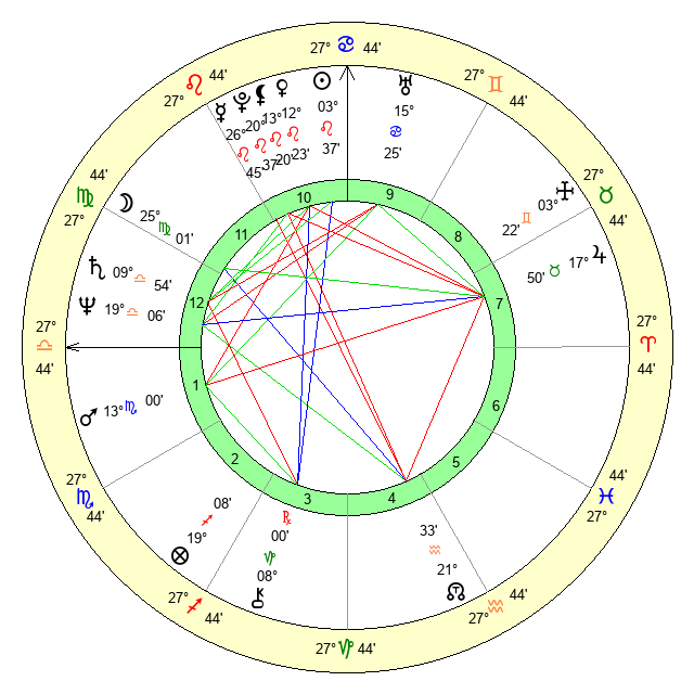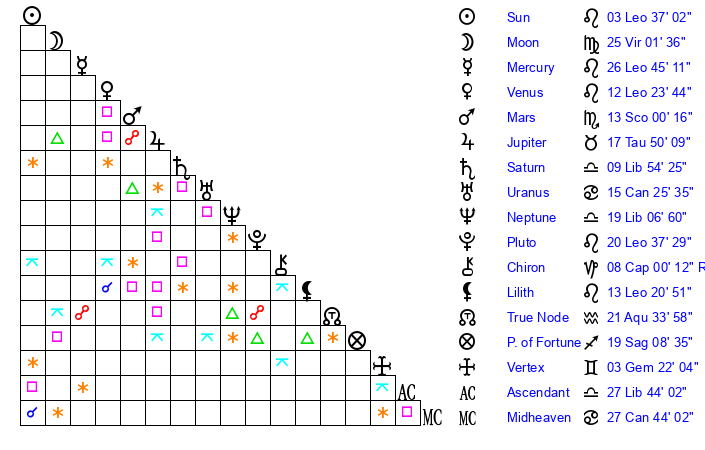 | Moon | 25 Virgo 1 | 27 Leo 48 | 8 Gemini 45 |