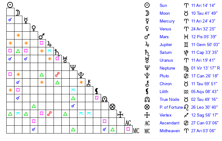 | Sun | 11 Aries 15 | 12 Aries 13 | 12 Cancer 55 |
