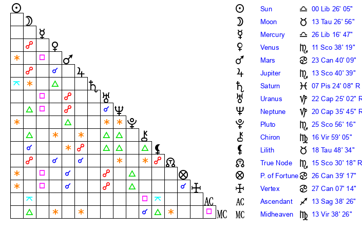 | Moon | 13 Taurus 27 | 21 Libra 57 | 27 Gemini 20 |