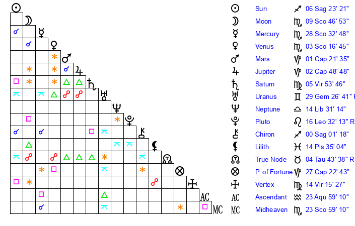 | Sun | 6 Sagittarius 23 | 6 Sagittarius 43 | 24 Aquarius 41 |