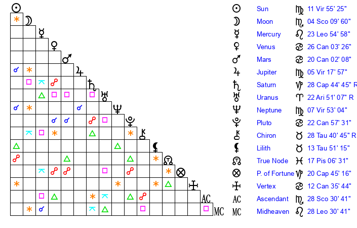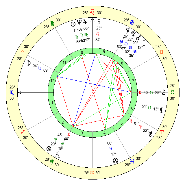 | Mercury | 23 Leo 55 | 4 Virgo 8 | 9 Sagittarius 37 |
