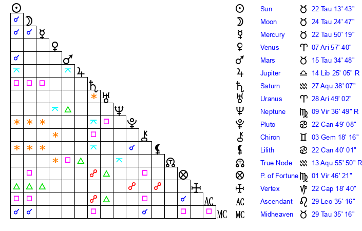| Sun | 22 Taurus 13 | 23 Taurus 11 | 19 Leo 16 |