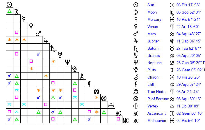 Moon | 6 Scorpio 47 | 3 Aquarius 33 | 10 Sagittarius 16 |
