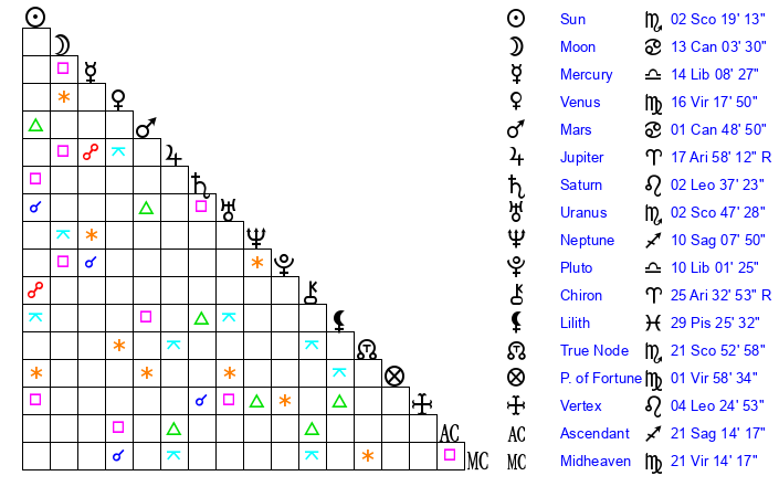 Sun | 2 Scorpio 19 | 3 Scorpio 26 | 21 Sagittarius 44 |
