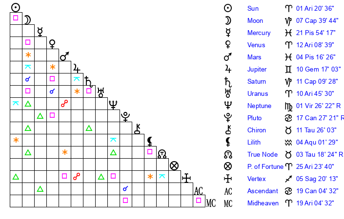 | Moon | 7 Capricorn 34 | 4 Capricorn 46 | 21 Gemini 27 |