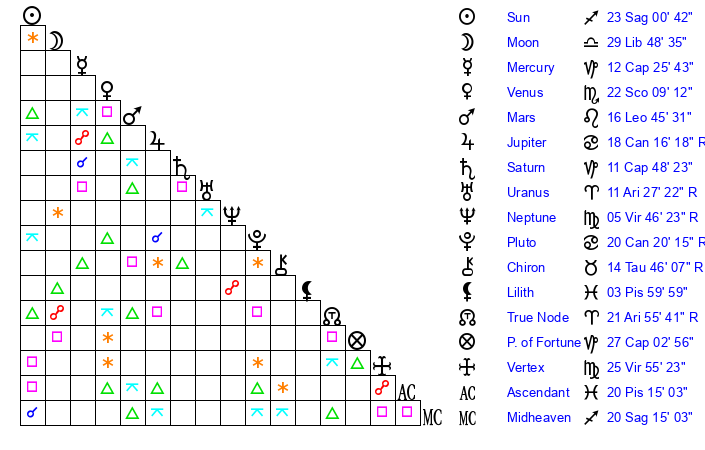 | Sun | 23 Sagittarius 1 | 23 Sagittarius 58 | 29 Pisces 7 |