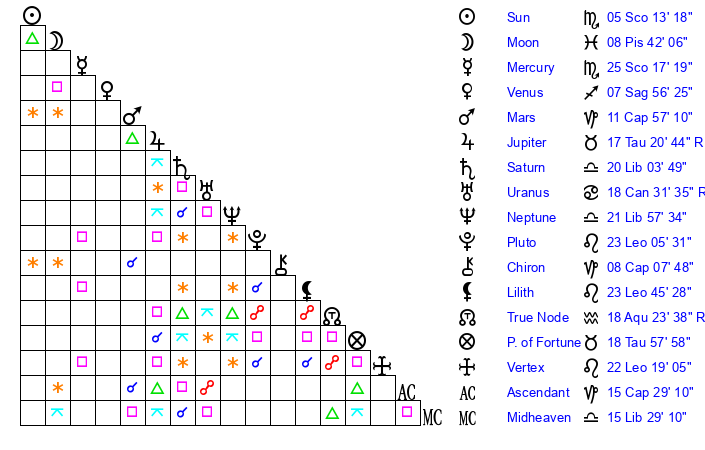 | Mercury | 25 Scorpio 17 | 29 Scorpio 13 | 4 Capricorn 42 |